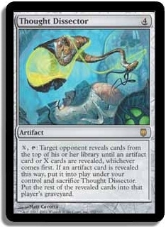 X, T: Target opponent reveals cards from the top of his or her library until an artifact card or X cards are revealed, whichever comes first. If an artifact card is revealed this way, put it into play under your control and sacrifice Thought Dissector. Put the rest of the revealed cards into that player's graveyard.