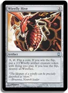 3, T: Flip a coin. If you win the flip, put a 2/2 Wirefly artifact creature token with flying into play. If you lose the flip, destroy all Wireflies.
