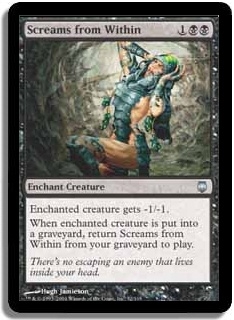 Enchanted creature gets -1/-1. When enchanted creature is put into a graveyard, return Screams from Within from your graveyard to play.