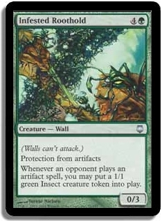 (Walls can't attack.) Protection from artifacts Whenever an opponent plays an artifact spell, you may put a 1/1 green Insect creature token into play.