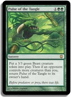 Put a 3/3 green Beast creature token into play. Then if an opponent controls more creatures than you, return Pulse of the Tangle to its owner's hand.