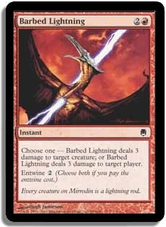 Choose one - Barbed Lightning deals 3 damage to target creature; or Barbed Lightning deals 3 damage to target player. Entwine 2 (Choose both if you pay the entwine cost.)