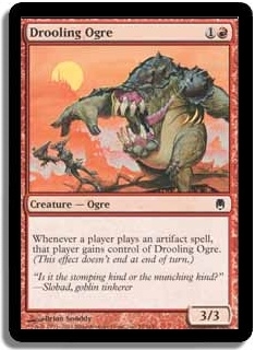 Whenever a player plays an artifact spell, that player gains control of Drooling Ogre. (This effect doesn't end at end of turn.)
