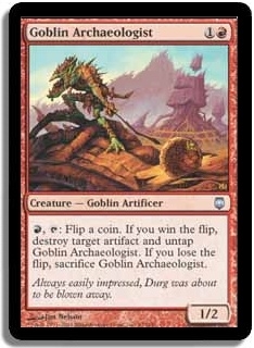 R, T: Flip a coin. If you win the flip, destroy target artifact and untap Goblin Archaeologist. If you lose the flip, sacrifice Goblin Archaeologist.