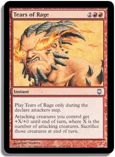 Play Tears of Rage only during the declare attackers step. Attacking creatures you control get +X/+0 until end of turn, where X is the number of attacking creatures. Sacrifice those creatures at end of turn.
