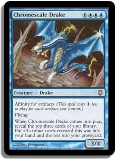 Affinity for artifacts (This spell costs 1 less to play for each artifact you control.) Flying When Chromescale Drake comes into play, reveal the top three cards of your library. Put all artifact cards revealed this way into your hand and the rest into your graveyard.