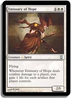 Flying Whenever Emissary of Hope deals combat damage to a player, you gain 1 life for each artifact that player controls.