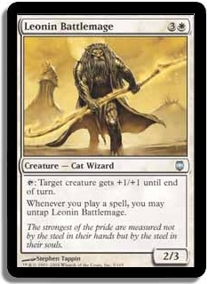 T: Target creature gets +1/+1 until end of turn. Whenever you play a spell, you may untap Leonin Battlemage.