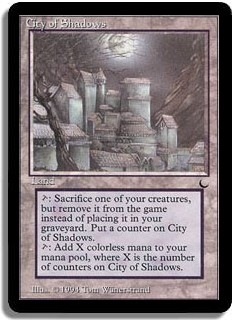 <T>: Sacrifice one of your creatures, but remove it from the game instead of placing it in your graveyard. Put a counter on City of Shadows. <T>: Add X colorless mana to your mana pool, where X is the number of counters on City of Shadows.
