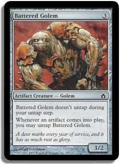 Battered Golem does not untap during your untap step. When an artifact comes into play, you may untap Battered Golem.