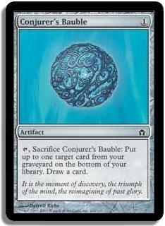 [Tap], Sacrifice Conjurer's Bauble: Put up to one target card from your graveyard on the bottom of your library. Draw a card.