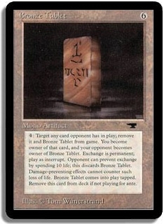 Comes into play tapped. <4>: Target any card opponent has in play; Remove it and Bronze Tablet from game. You become owner of that card, and your opponent becomes owner of Bronze Tablet. that player may prevent this exchange by paying 10 life; if he or she does so, destroy Bronze Tablet. Effexts that prevent or redirect damage cannot be used to counter this loss of life. Play this ability as an interrupt. Remove Bronze Tablet from your deck before playing if not playing for ante.