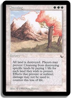 All land is destroyed. Players may prevent Cleansing from destroying specific lands by paying 1 life for each land they wish to protect. Effects that prevent or redirect damage may not be used to counter this loss of life.