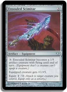 [3]: Ensouled Scimitar becomes a 1/5 creature with flying until end of turn.