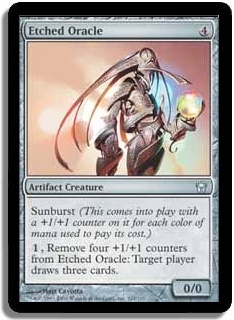 [1], Remove four +1/+1 counters from Etched Oracle: Target player draws three cards.