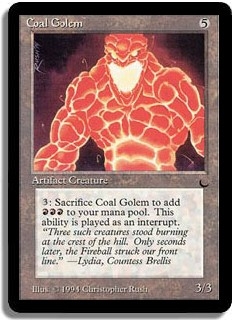 <3>: Sacrifice Coal Golem to add <RRR> to your mana pool. This ability is played as an interrupt.