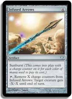 [Tap], Remove X charge counters from Infused Arrows: Target creature gets -X/-X until end of turn.