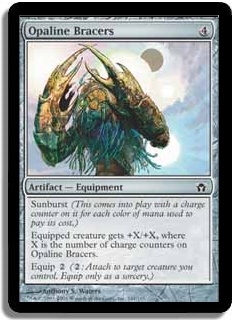 Equipped creature gets +X/+X, where X is the number of charge counters on Opaline Bracers.