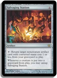 Whenever a creature is put into a graveyard from play, you may untap Salvaging Station.