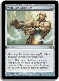 [2], [Tap]: Gain control of target creature with power is less than or equal to the number of islands you control as long as Vedalken Shackles stays tapped.