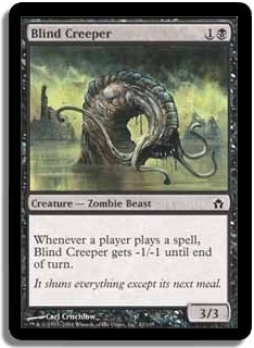 Whenever a player plays a spell, Blind Creeper gets -1/-1 until end of turn.