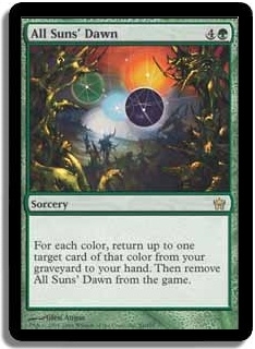 For each color, return up to one target card of that color from your graveyard to your hand. Then remove All Suns' Dawn from the game.