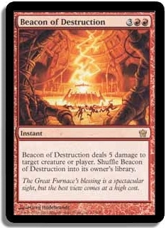 Beacon of Destruction deals 5 damage to target creature or player. Shuffle Beacon of Destruction into your library.