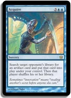 Search target opponent's library for an artifact card and put that card into play under your control. Then that player shuffles his or her library.