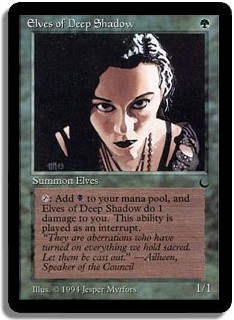 <T>: Add <B> to your mana pool, and Elves of Deep Shadow do 1 damage to you. This ability is played as an interrupt.