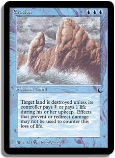 During his or her upkeep, target land's controller pays <1> or 1 life, or target land is destroyed. Effects that prevent or redirect damage cannot be used to counter this loss of life.