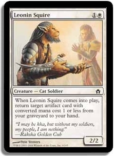 When Leonin Squire comes into play, return an artifact card with converted mana cost 1 or less from your graveyard to your hand.