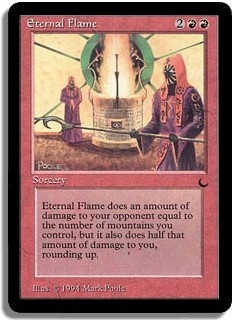 Eternal Flame does an amount of damage to your opponent equal to the number of mountains you control, but it also does half that amount of damage to you, rounding up.