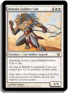 As long as Raksha is equipped, Cats you control get +2/+2 and have double strike.