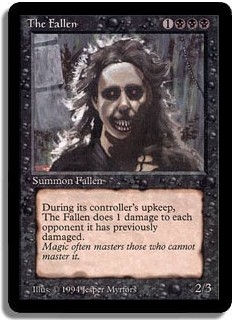 During its controller's upkeep, The Fallen does 1 damage to each opponent it has previously damaged.