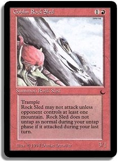 Trample. Cannot attack if defending player controls no mountains. Rock Sled does not untap during your untap phase if it attacked during your last turn.