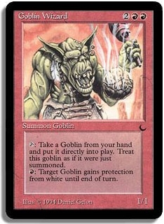 <T>: Take a Goblin from your hand and put it directly into play. Treat this goblin as if it were just summoned. <R>: Target Goblin gains protection from white until end of turn.