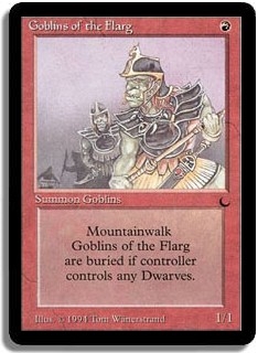 Mountainwalk. Goblins of the Flarg are buried if controller controls any Dwarves.