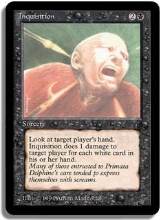 Look at target player's hand. Inquisition does 1 damage to target player for each white card in his or her hand.
