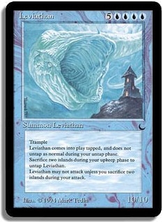 Trample. Comes into play tapped and does not untap during your untap phase. During your upkeep, you may sacrifice two islands to untap Leviathan. Leviathan cannot attack unless you sacrifice two islands during your attack.