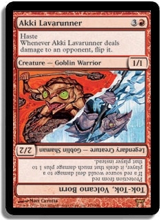 When Akki Lavarunner deals damage to an opponent, flip it.