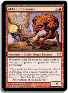 Whenever Akki Underminer deals combat damage to a player, that player sacrifices a permanent.