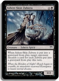 When Ashen-Skin Zubera is put into a graveyard from play, target opponent discards a card for each Zubera that went into a graveyard from play this turn.
