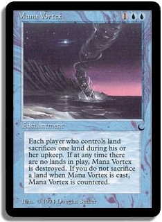 Each player who controls land sacrifices one land during his or her upkeep. If at any time there are no lands in play, Mana Vortex is destroyed. If you do not sacrifice a land when Mana Vortex is cast, Mana Vortex is countered.