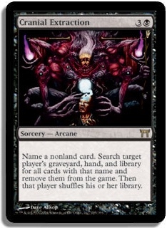 Name a nonland card. Search target player's graveyard, hand, and library for all cards with that name and remove them from the game. Then that player shuffles his or her library.