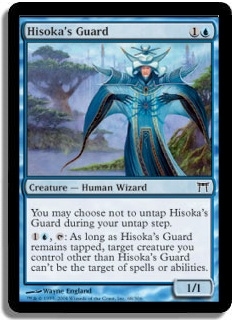 [1][U], [Tap]: As long as Hisoka's Guard remains tapped, another target creature you control can't be the target of spells or abilities.
