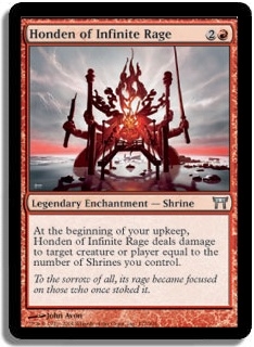 At the beginning of your upkeep, Honden of infinite Rage deals damage to target creature or player equal to the number of Shrines you control.