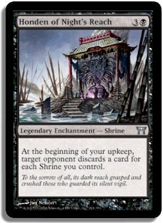 At the beginning of your upkeep, target opponent discards a card for each Shrine you control.