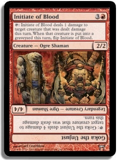 [Tap]: Initiate of Blood deals 1 damage to target creature that has already been damaged this turn. If that creature is put into a graveyard this turn, flip Initiate of Blood.