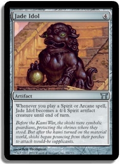Whenever you play a spirit or arcane spell Jade Idol becomes a 4/4 spirit artifact creature until the end of turn.