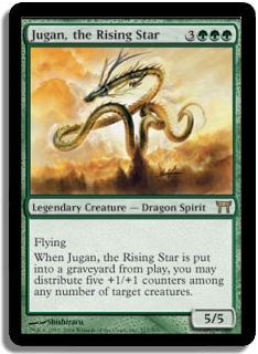 When Jugan, the Rising Star is put into a graveyard from play, you may distribute 5 +1/+1 counters among any number of target creatures.